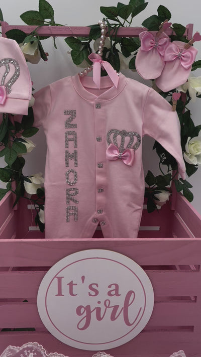 Voici le summum de l'élégance pour nouveau-né : l' ensemble Layette Lil' Lady . Conçu pour les plus petits des monarques, cet ensemble rayonne de grâce et de sophistication. Orné de motifs de couronne enchanteurs et d'embellissements scintillants, il est conçu pour conférer à votre nouveau-né une aura de royauté dès son tout premier jour.