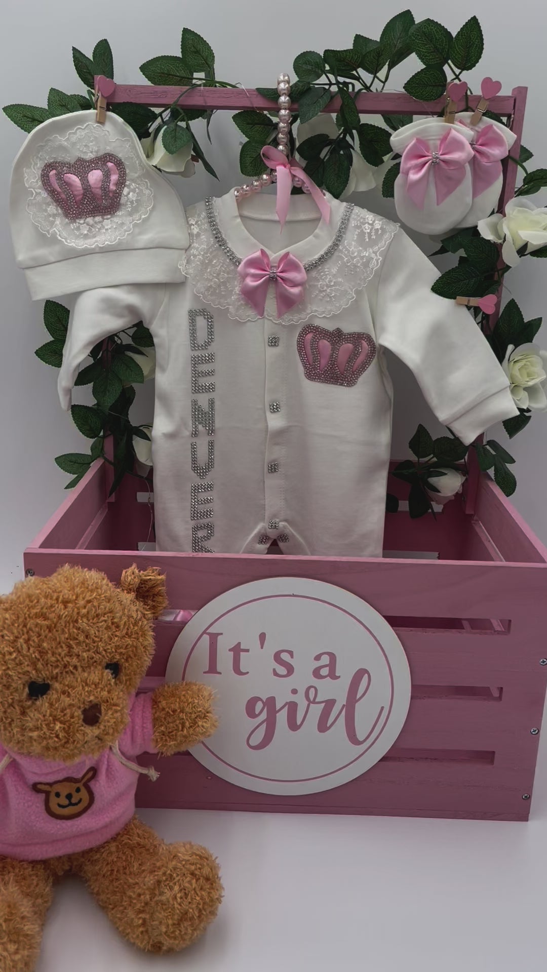Introducing the "Purest Angel Princess Set" a beautifully crafted ensemble designed to dress your little one in heavenly style. This set features a soft white onesie, elegantly adorned with sparkling silver letters and a heart-warming pink crown motif that signifies both purity and royalty. A delicate pink bow at the collar and matching bows on the cuffs add a touch of gentle femininity, enhancing the angelic appearance.